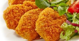 Os Nuggets de Frango são feitos de pedaços de frango, empanados e levemente fritos.